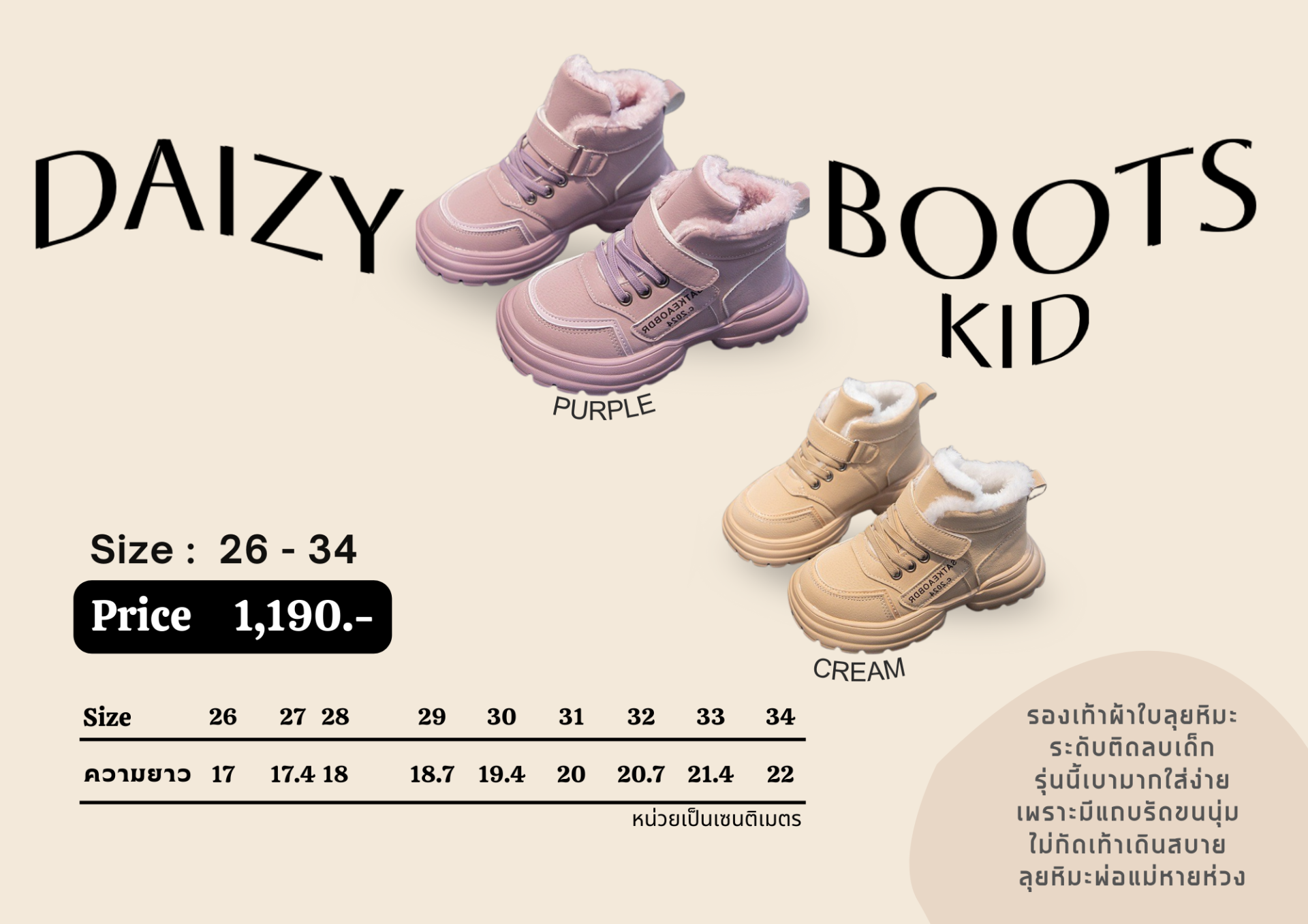DAIZY BOOTS KID รองเท้าผ้าใบลุยหิมะเด็ก กันหนาวได้ดี ป้องกันหิมะเข้าบู๊ท ด้านในบุขนนุ่มมาก เดินสบายไม่กัดเท้า ให้ความอุ่นพร้อมป้องกันหิมะ